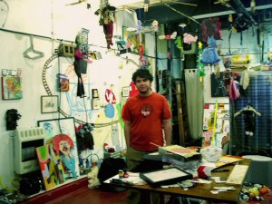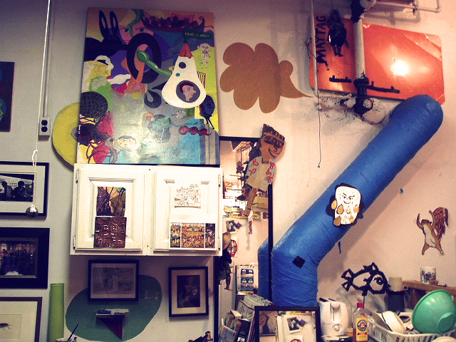 This was my studio at the Brew House, a non-profit artist co-op located on the South Side of Pittsburgh. Below are some photographs of the space from 2003 – 2005. I was creating puppet shows, paintings, drawings and lots of kinetic sculpture at the time. To get to the studio, I had to take an old freight or passenger elevator. (depending on which one was working) The window looked out on a dilapidated wall of rusty pipes in a corridor of the 1890 brewery building. To visitors, I probably seemed like the Sebastian character from Blade Runner, living in an old industrial structure with a bunch of puppets!