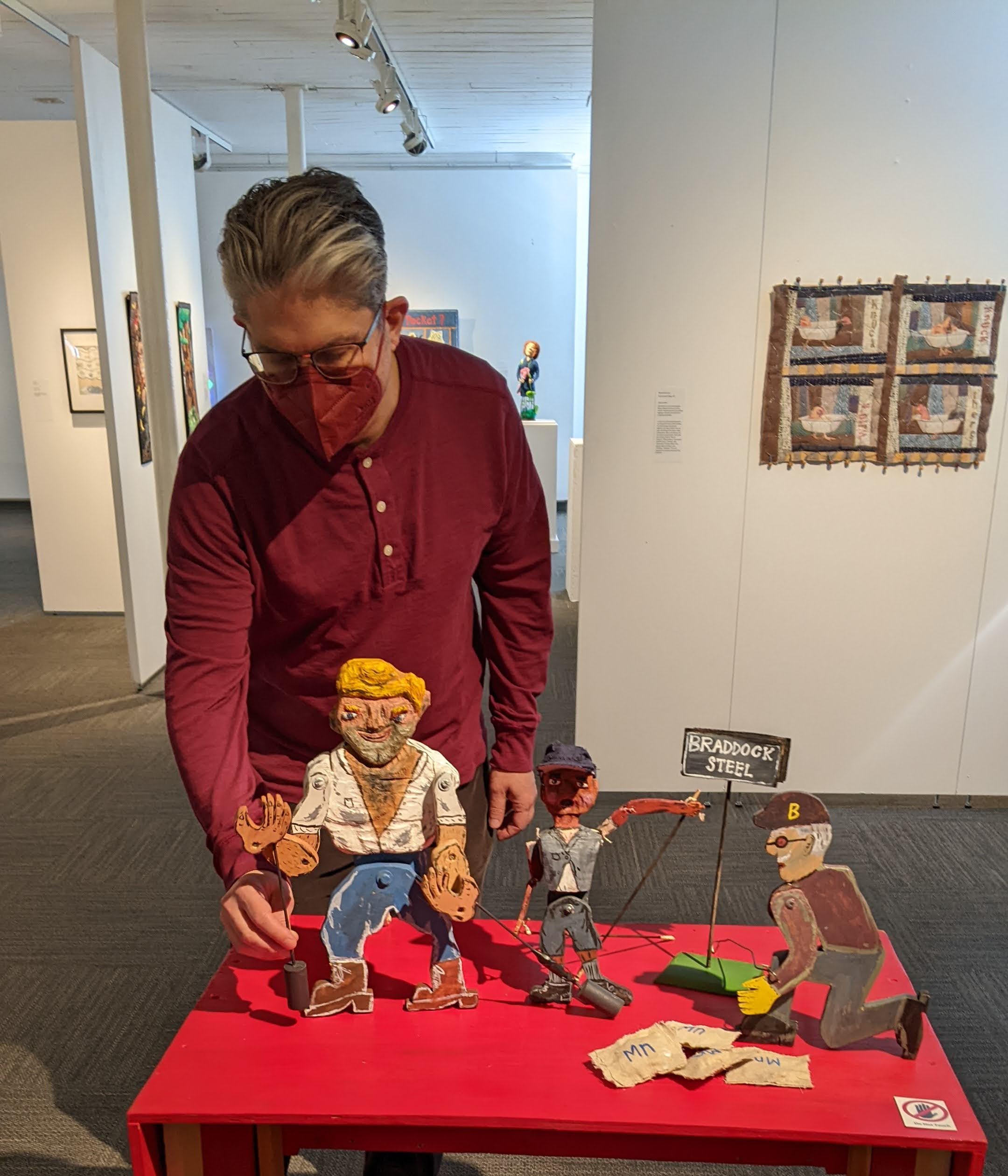In my puppet show (created with Pittsburgh artist Mike Cuccaro), Joe arrives in America and meets a young newspaper delivery boy, Newsie Ned, who helps him get acquainted with American life. Joe works in the steel mill with Braddock Bob, who loads bags of manganese during the steelmaking process.
