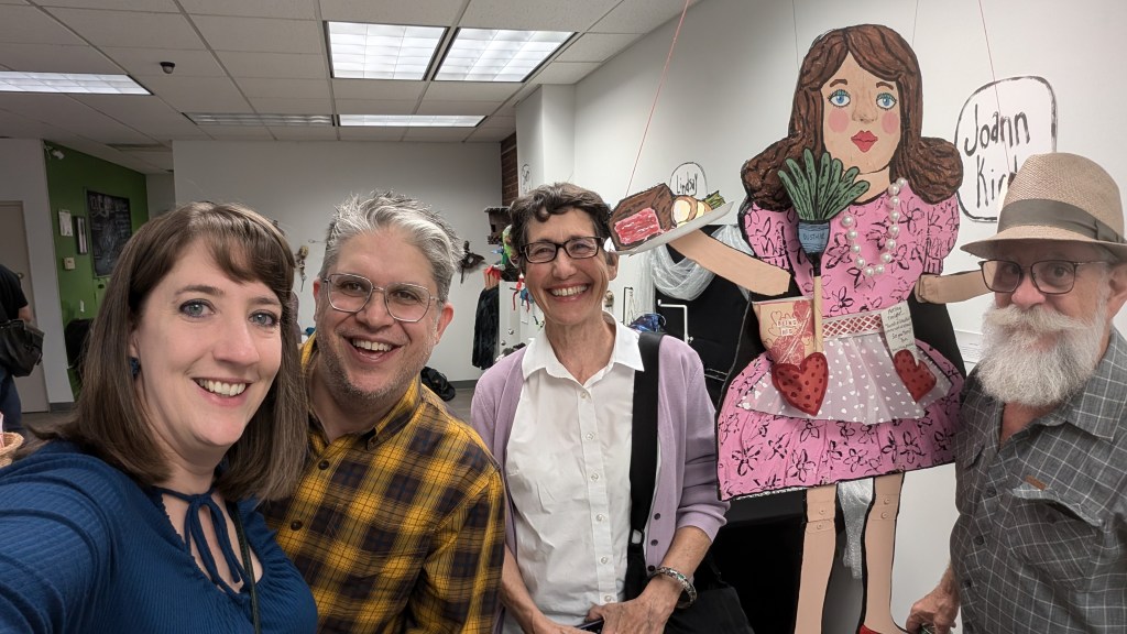 Kristen Sarver, Tom Sarver, Joann Kielar and Albert Pantone, with Joann’s Traditional Wife puppet at the Puppets and Performance opening reception.