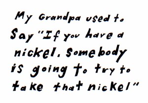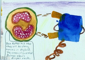 I made this doodle ten years ago.  I was sick in bed watching TV all day. I think I’m the blob shape on the couch.  The blue robot thing must be the cloning machine.