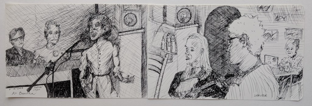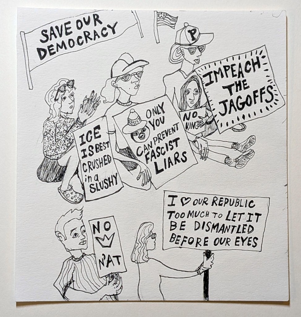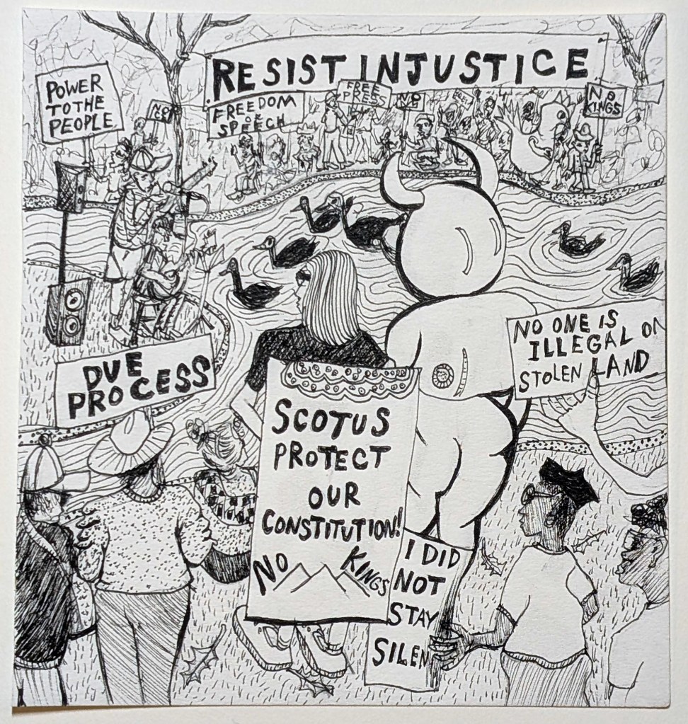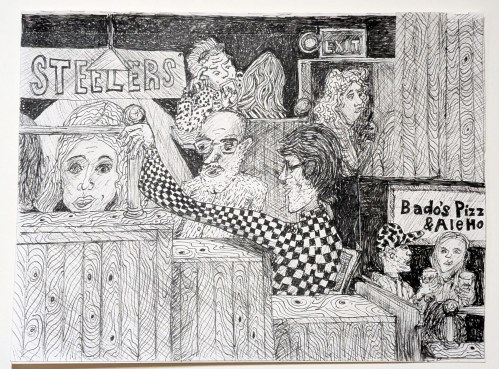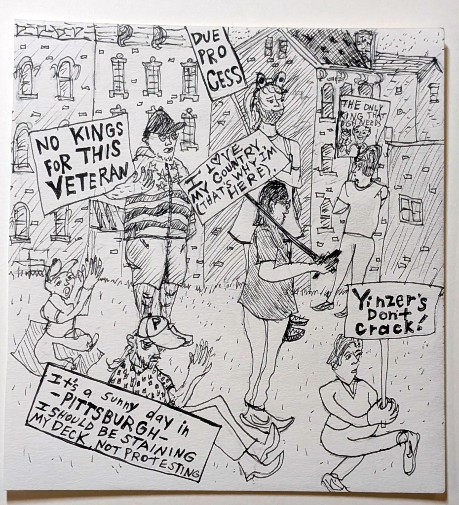 Mineo’s Pizza #2, Squirrel Hill, October 2025.Mineo’s Pizza #3, Squirrel Hill, October 2025.No Kings, Resist, 5 5/8″ x 5″, Allegheny Center, October 2025. No Kings, Jagoffs, 5 5/58″ x 5″, Allegheny Center, October 2025.No Kings, Due Process, 5 5/8 x 5, Allegheny Center, October 2025Problem Show at Bantha Tea, Bloomfield – Garfield, November 2024. Last day at Bado’s Pizza, Mt. Lebanon, November 2023.Tina’s, Bloomfield, November 2023. PPG Place, Downtown, October 2023. North Park Boathouse, McCandless, October 2023.Triangle Park, Downtown, May, 2022. Fairmont Valet, Downtown, May 2022.