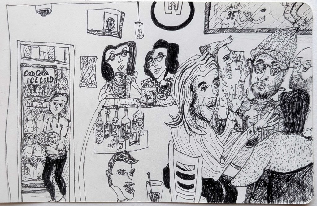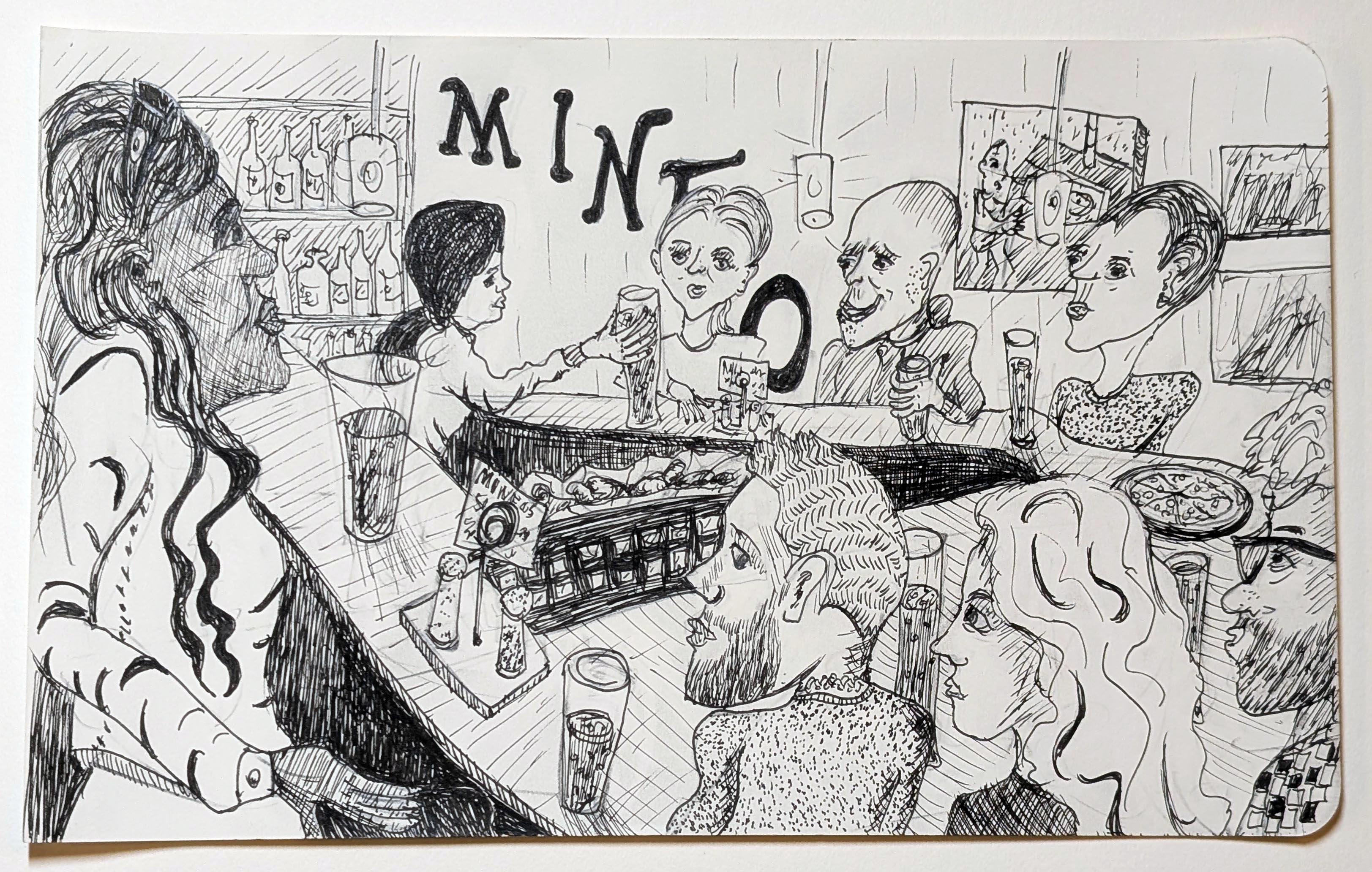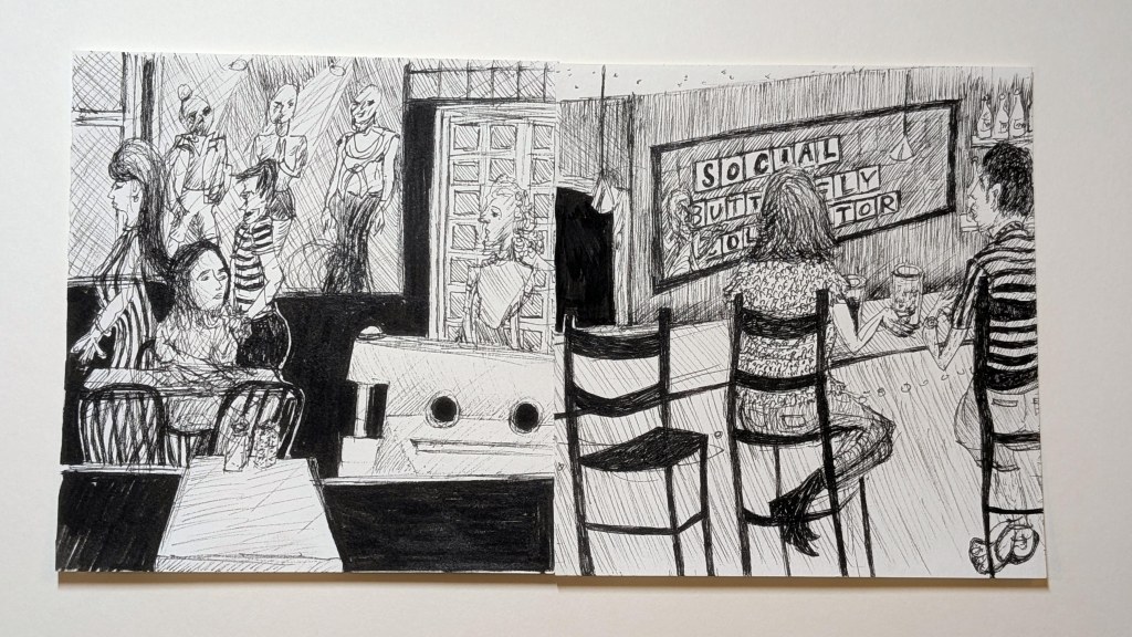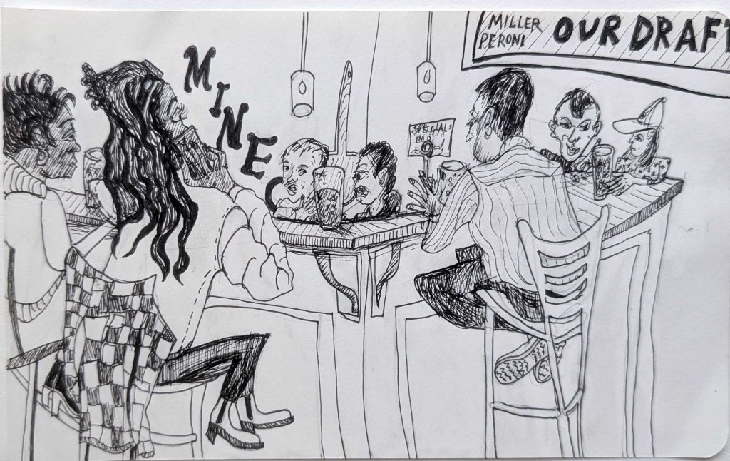 Bar drawing with Rob. TRYP Hotel rooftop, Central Lawrenceville, 10″ x 8 “, June, 2021.