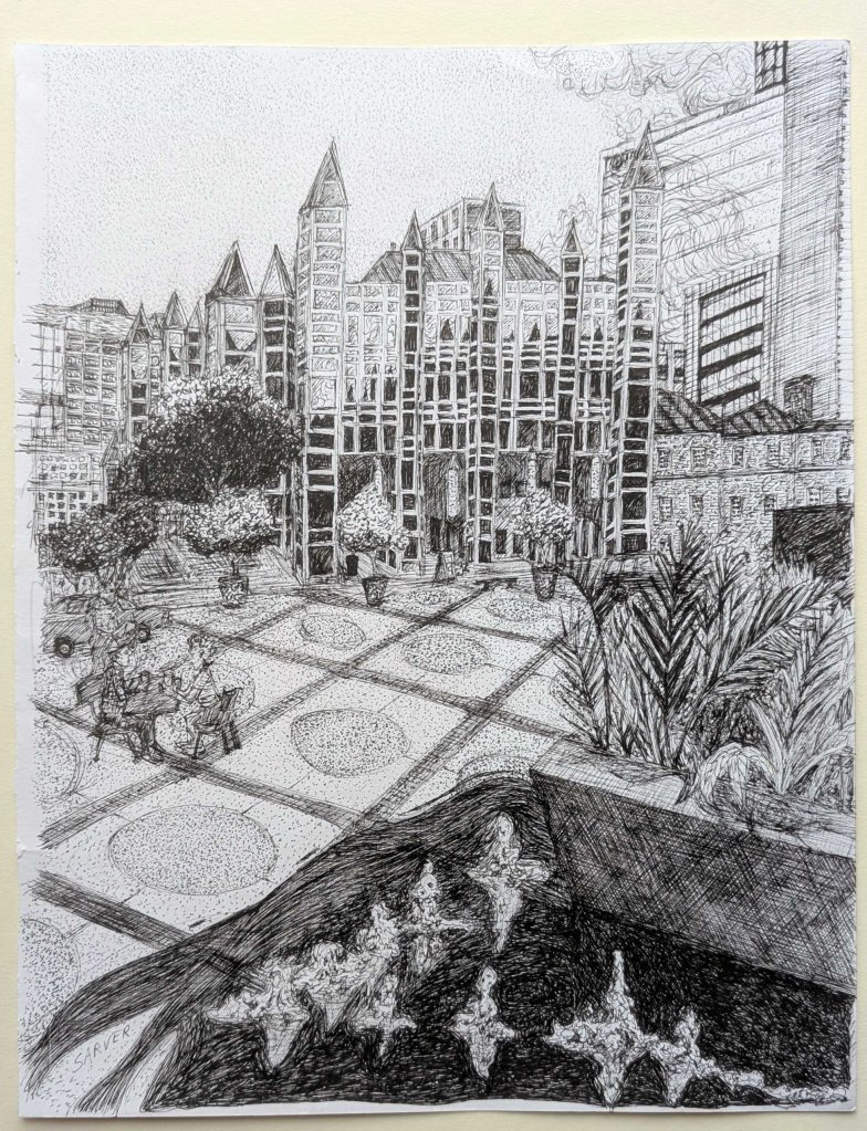 Katz Plaza, Downtown, 5.5″ x 6″, September, 2021.