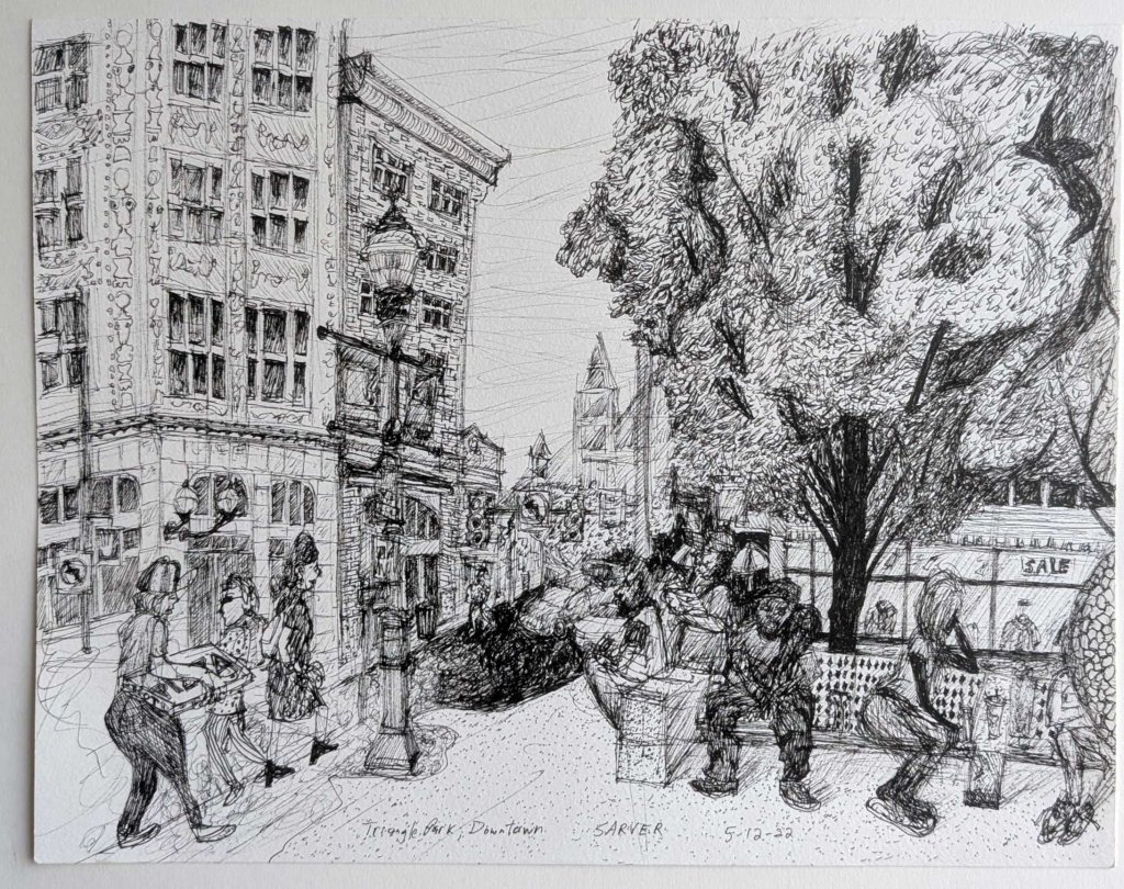 Knoxville on the border of Mt. Oliver Borough. 14″ x 11″, March 9, 2020.Light rail, The T, making its way down Broadway Avenue, Beechview. It was a cold, windy day. I could smell the Mexican food cooking at nearby restaurants. 17″ x 14″, March 3, 2020.Sketching from the balcony of Arcade Shops, a Downtown mall and food court. A collage of inside/outside imagery. February 28, 2020.Bantha Tea Bar, Penn Avenue, Bloomfield – Garfield. This gritty, but rapidly gentrifying, neighborhood holds monthly Unblurred gallery crawls. 9.5″ x 12″ November 22, 2019.South Side, looking down S. 15th Street towards East Carson Street from the pedestrian train crossing at the base of the South Side Slopes. I lived in this neighborhood for several years. I love the mix of old church architecture, refurbished storefronts and new structures. 5.75″ x 8.5″, January 7th, 2020. SOLDEntrance to Highland Park. 10″ x 8.5″, September 12, 2019.Located in Central Lawrenceville, Allegheny Cemetery is a sprawling park-like complex with ponds, fountains and tree-lined paths. As I sketched this pond, a couple pulled up and ate a box of doughnuts in their car. 14″ x 11″, October 26, 2019.The Squirrel Hill Cafe, better known as the Squirrel Cage, Squirrel Hill South. 8.5″ x 5.75″, February 10th, 2020. SOLDSquirrel Hill North, Forbes Avenue. 5.5″ x 8.5″, September 11, 2019Pittsburgh Zoo and PPG Aquarium, Highland Park. During the winter months, the zoo holds regular Saturday penguin parades. Crowds of visitors line up along zoo pathways, eager to catch a glimpse of the waddling creatures. 5.5″ x 6″, February 15, 2020. SOLDWaiting to get my hair cut at The Humble Barber, Brighton Heights. 5.5″ x 6″, Fall 2019.Murray Avenue, Greenfield. 8.5″ x 5.75″, February 6th, 2020. SOLDView from Points of View Park, Grandview Avenue, Duquesne Heights. I was looking down the Ohio River towards Brunot’s Island. 17″ x 14″, January 15, 2020.Pirates baseball at PNC Park, North Shore. 4″ x 6″, September 17, 2019. SOLDHomewood South. One of the most beautiful libraries of the Carnegie network, the Homewood branch. 10″ x 7″, December 10, 2019. SOLDTrinity Cathedral in Downtown Pittsburgh. The Episcopal, Gothic-style church was completed in 1872. The site holds the oldest marked graves west of the Atlantic Seaboard. 14.5″ x 23.5″, September 24, 2019. SOLDMiddle Hill District, view looking out the window of the new Carnegie Library. 9″ x 12″, February 22nd, 2020.Phipps Conservatory and Botanical Gardens, Central Oakland. The plants and antique structures of the conservatory are amazing, but on this trip, I tried to capture some of the human activity. 5.5″ x 6″, February 9, 2020.Part 2 of Phipps Conservatory and Botanical Gardens. 5.5″ x 6″, February 9, 2020.Upper Hill District. View from reservoir at Robert E. Williams Memorial Park looking west. 5.5″ x 8.5″, March 4, 2020.The row houses have been thinned out a bit in the California-Kirkbride neighborhood of the North Side. 5.5″ x 8.5″, March 18, 2020. SOLDEast Ohio Street, East Allegheny. 24″ x 19″, April 8, 2020.Point Breeze. The Clayton Mansion, once the majestic home of the Henry Clay Frick family, is now part of The Frick Museum and Gardens. 11″ x 14″, October 12, 2019.Located on the western edge of the city bordering McKees Rocks, Windgap is a quiet area of overgrown fields and light industry mixed with areas of older homes. I often take a shortcut past this area of towering power lines. 12.5″ x 9″, February 17, 2020. SOLDWoods Run Branch of the Carnegie Library of Pittsburgh, Marshall-Shadeland neighborhood. 8.5″ x 5.75″, January 16, 2020.PPG Aquarium at Pittsburgh Zoo, Highland Park. 5.5″ x 6″, February 15, 2020.Motorcycle cruising down Butler Street, Lower Lawrenceville. Featuring former Pittsburgh Wash House & Public Baths building (1903). 17″ x 14″, February 6, 2020. SOLDA gritty corner of Downtown Pittsburgh. Smithfield Street and the Boulevard of The Allies. 8.5″ x 5.5″, February 29, 2020. SOLDNoblestown Road Shop n’ Save, Westwood. As I sketched, I noticed a woman eating a Taco Bell lunch in a nearby vehicle. 8.5″ x 5.5″, January 8, 2020.I stopped at Ka-Fair Coffee in Morningside for breakfast and sketched the view out the front window. Some repairs were happening on a nearby building. 5.5″ x 6″, January 23, 2020.A secluded spot at the beginning of social distancing. Nine Mile Run Trailhead in SwisshelmPark. The watershed has undergone major remediation since Pittsburgh’s industrial era. The impressive bridge structure is I-376 just outside of the eastern end of the Squirrel Hill tunnels. 12″ x 9″, March 17, 2020. SOLDAs I ate breakfast, people around me were nervously talking about the pandemic. Kelly O’s Diner, Strip District. 5.5″ x 6″, March 11, 2020.Some city stairs coming down the South Side Slopes. 8.5″ x 5.5″, March 8, 2020.Lots of tall, old, wood-framed houses adjacent to a majestic Classical church in Polish Hill. 5.5″ x 8.5″, March 5, 2020.Schenley Plaza, Central Oakland. 5.5″ x 6″, September 25, 2019.A small Beto O’Rourke rally organized by University of Pittsburgh students at Schenley Plaza. 5.5″ x 6″, September 25, 2019. SOLDCrawford-Roberts neighborhood of the Hill District. August Wilson House, the childhood home of the Pittsburgh playwright. The 1727 Bedford Avenue site is being transformed into a center for arts and community programs. 12″ x 9″, March 13, 2020. SOLDThe last Farmer’s Market day of 2019, Market Square, Downtown Pittsburgh. 5.5″ x 6″, October 24, 2019.People gathering at the public tables at Market Square, Downtown Pittsburgh, during the last Farmer’s Market day of 2019. 5.5″ x 6″, October 24, 2019.A construction site along Butler Street, Lower Lawrenceville. 5.75″ x 8.5″, February 12, 2020.Pennsylvania Macaroni, Penn Avenue, Strip District. 5.5″ x 8.5″ September 10, 2019.Forbes Aven