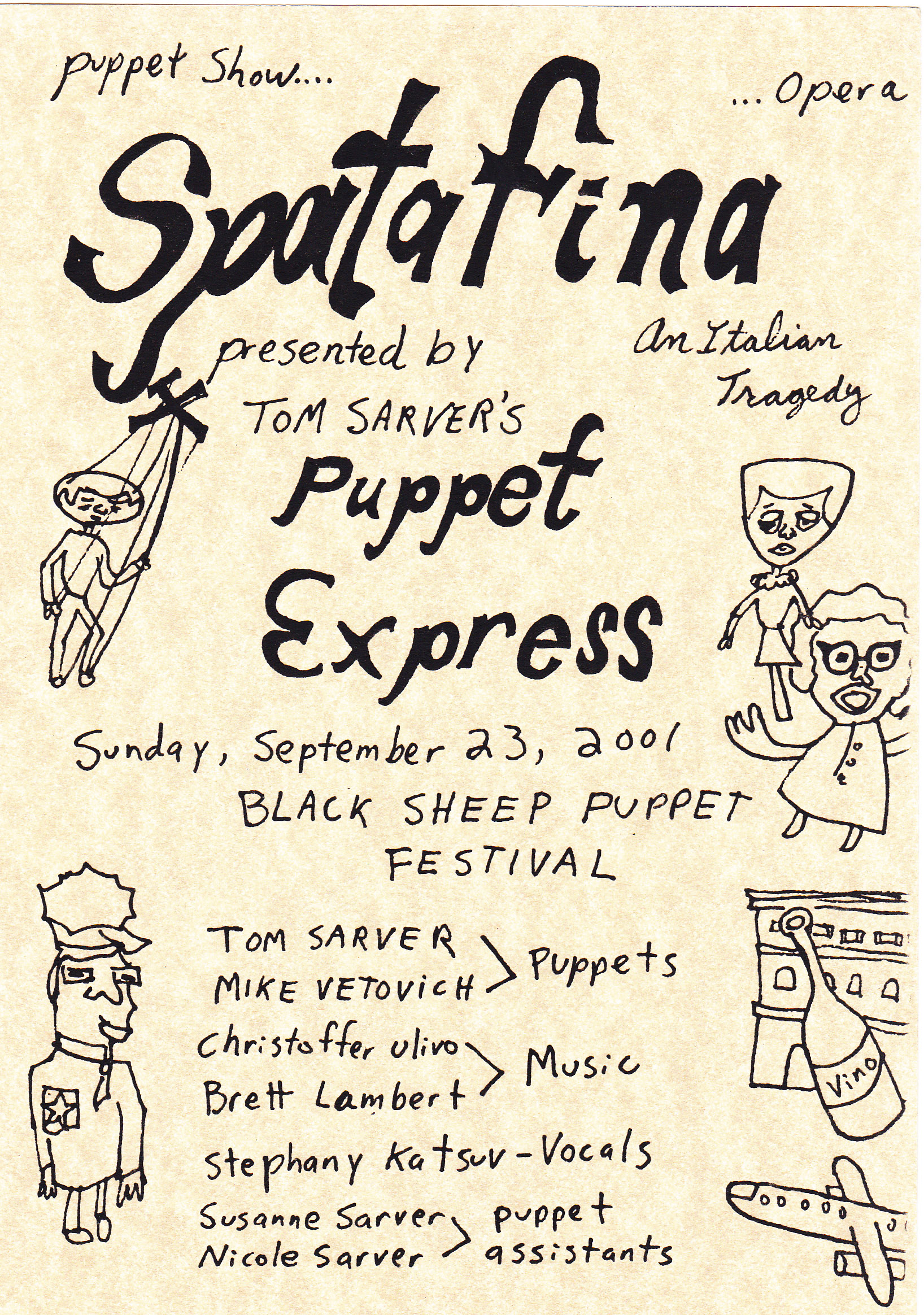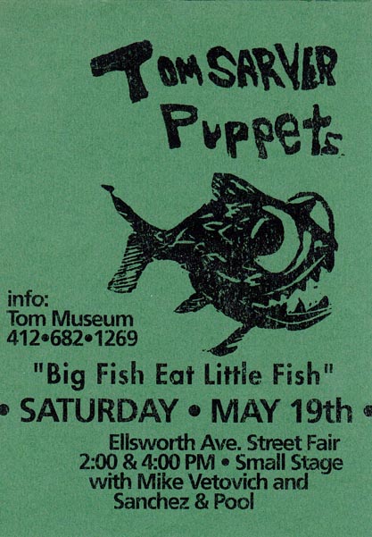 Based in Pittsburgh, PA, the Tom Sarver Puppet Express has performed at art galleries, museums and festivals for audiences of all ages. Past venues include the Westmoreland Museum of American Art, Carnegie Museum of Art, Mattress Factory and the Dairy Barn Art Center.