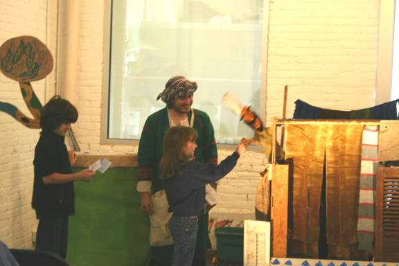 Preparing to perform Perseus, Medusa and the Magic Frisbee at the 5th Annual Black Sheep Puppet Festival, October 2003.