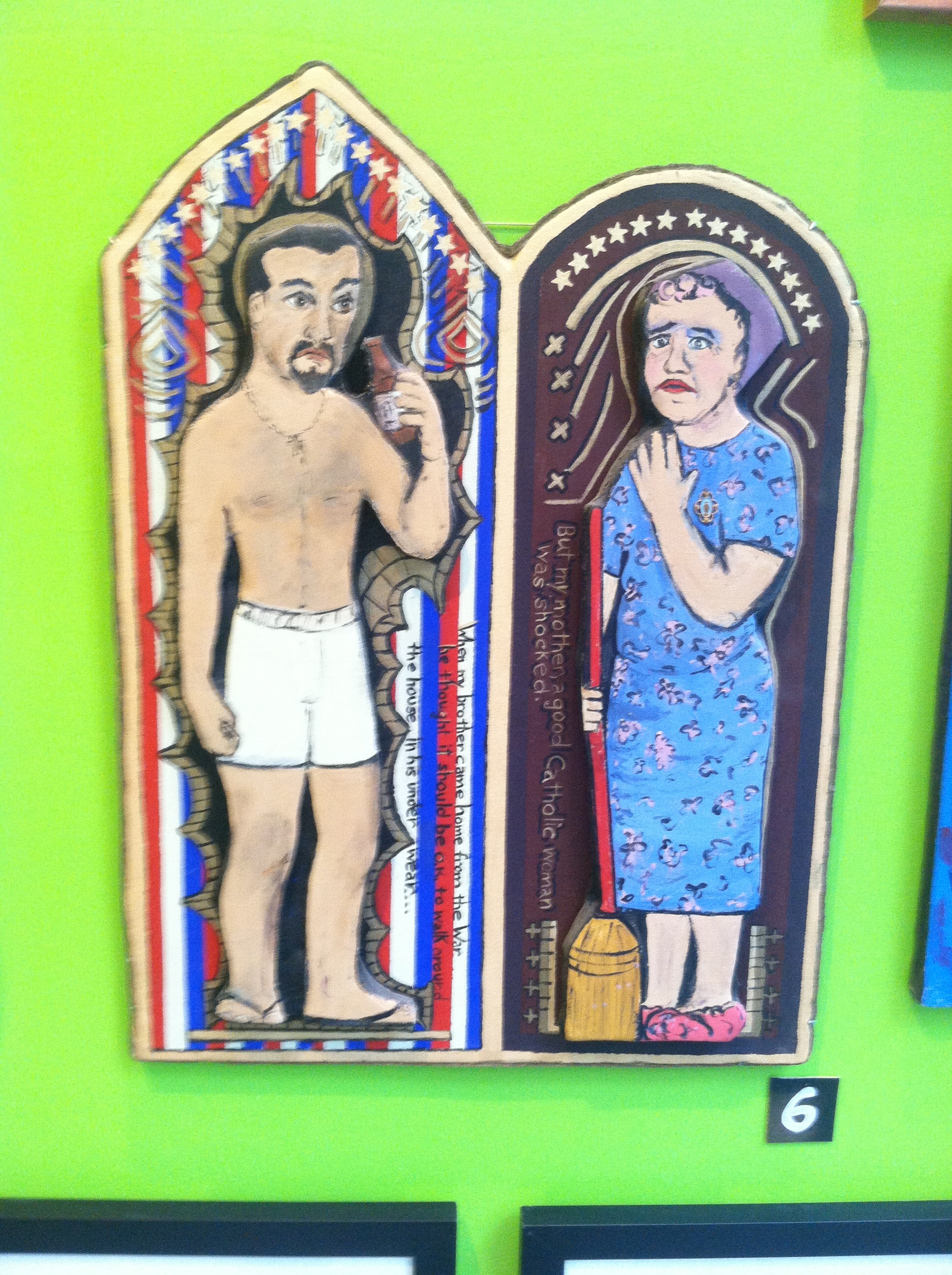 6. Joann Kielar, Post-War, wood, fabric, acrylic paint, religious medal, military insignia. “Post-War is based on a memory of the adjustment difficulties experienced in our family after my brother was discharged from the Army, after being drafted and serving in the Vietnam War. The piece is infused with symbols of Catholicism and daily life in a blue-collar family – far different from life in the military.”– Joann Kielar