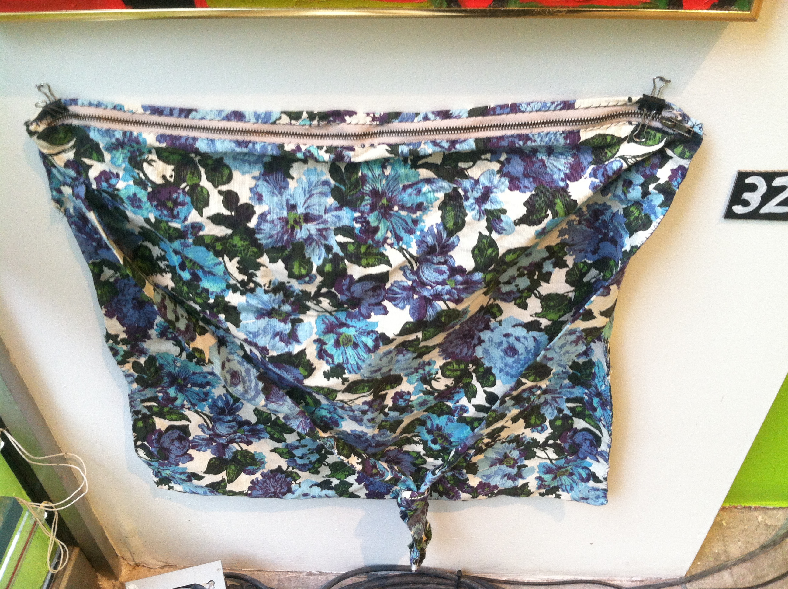 13. Doug Hill, hand-stitched bag. Aside from making cardboard gears, Hill uses whatever he can find to design basic life tools. Here is one of the bags that he uses for shopping and toting his art supplies. Hill often makes his works at coffee shops and libraries.