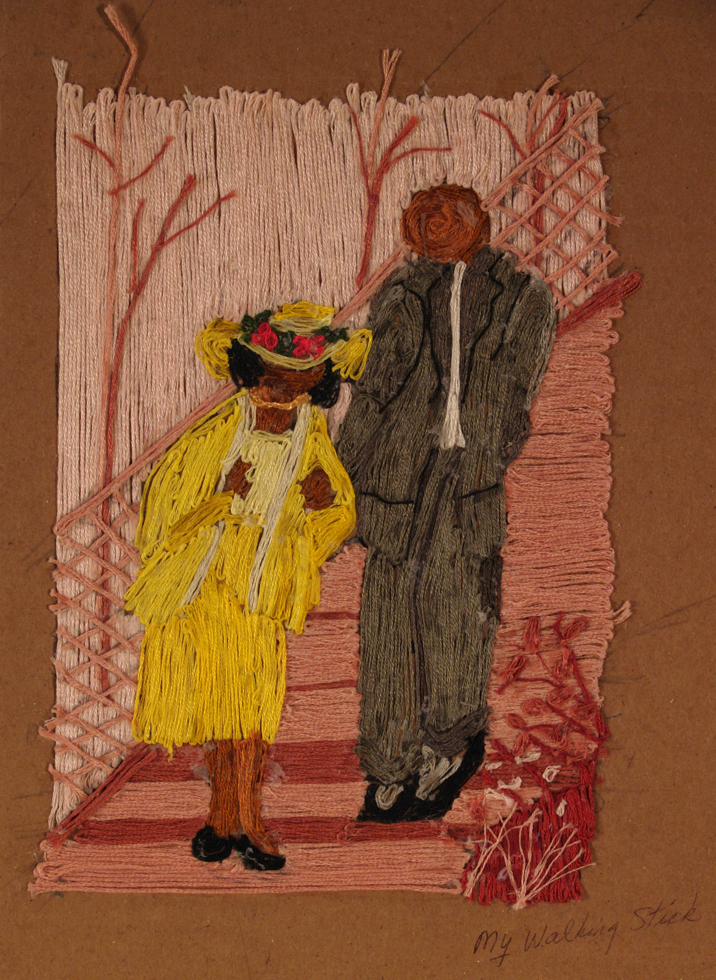 7. Dorothy Williams, My Walking Stick, embroidery floss on cardboard. In this string painting, Ms. Williams depicts her son helping her to church.