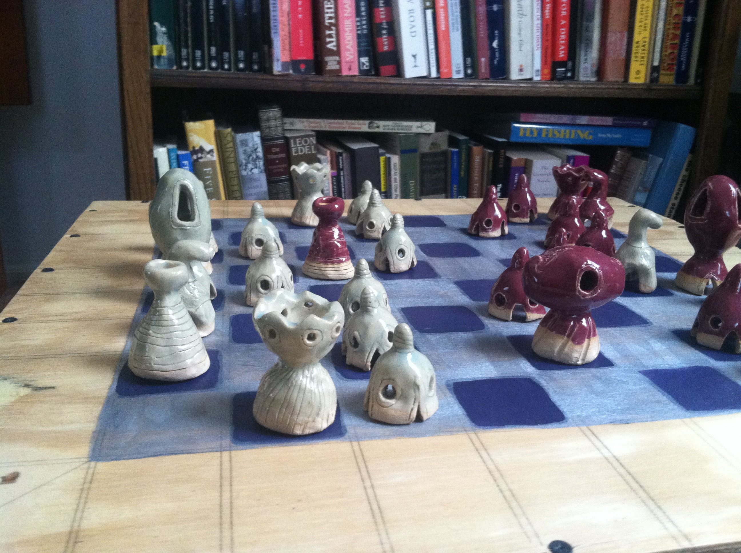 35. Tom Sarver, chess set, hand-built, glazed ceramic pieces, wooden board.