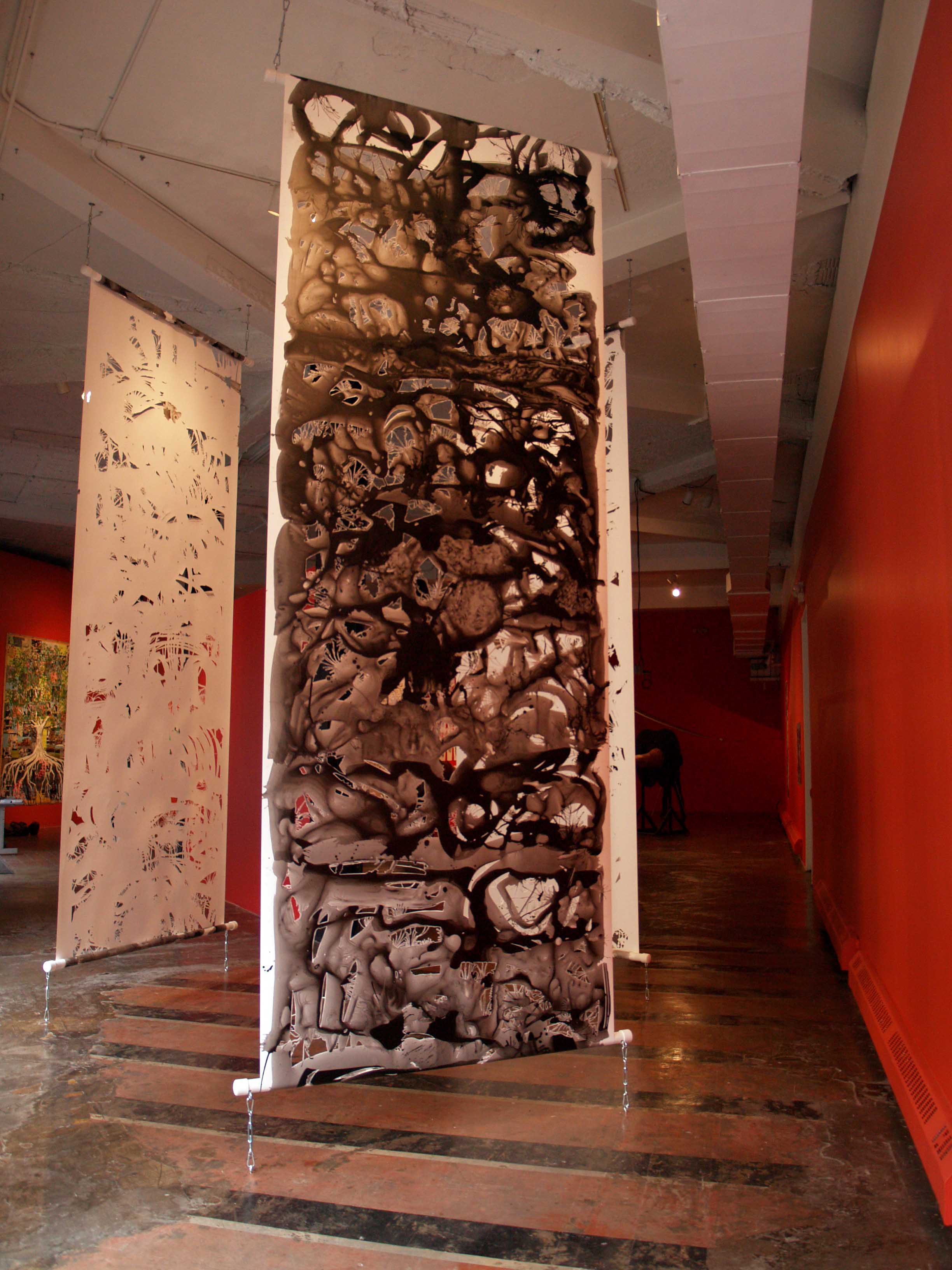 Interdisciplinary artist Liz Hammond has been active in music, performance art, sculpture, and theater. In the 1990s she was a member of the Industrial Arts Co-op, the team of salvage artists that created the monumental Carrie Deer sculpture at the abandoned Carrie Furnace industrial site in Rankin, Pennsylvania. Recently, Hammond has been creating a collection of soft sculpture fiber work she calls Simple Cells. These abstract works, exploring form and materials, suggest ideas for larger structures.
